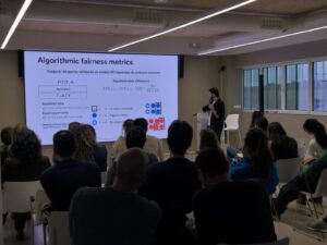 La ponencia corrió a cargo de Adrián Arnáiz, investigador de la Fundación ELLIS Alicante, quien ofreció una visión general sobre los riesgos asociados al uso de la inteligencia artificial en la toma de decisiones. Durante su intervención, puso el foco en los sesgos y en la denominada justicia algorítmica, explicando cómo estos pueden aparecer en distintas fases del desarrollo y uso de los sistemas de IA, desde los datos hasta su aplicación final.